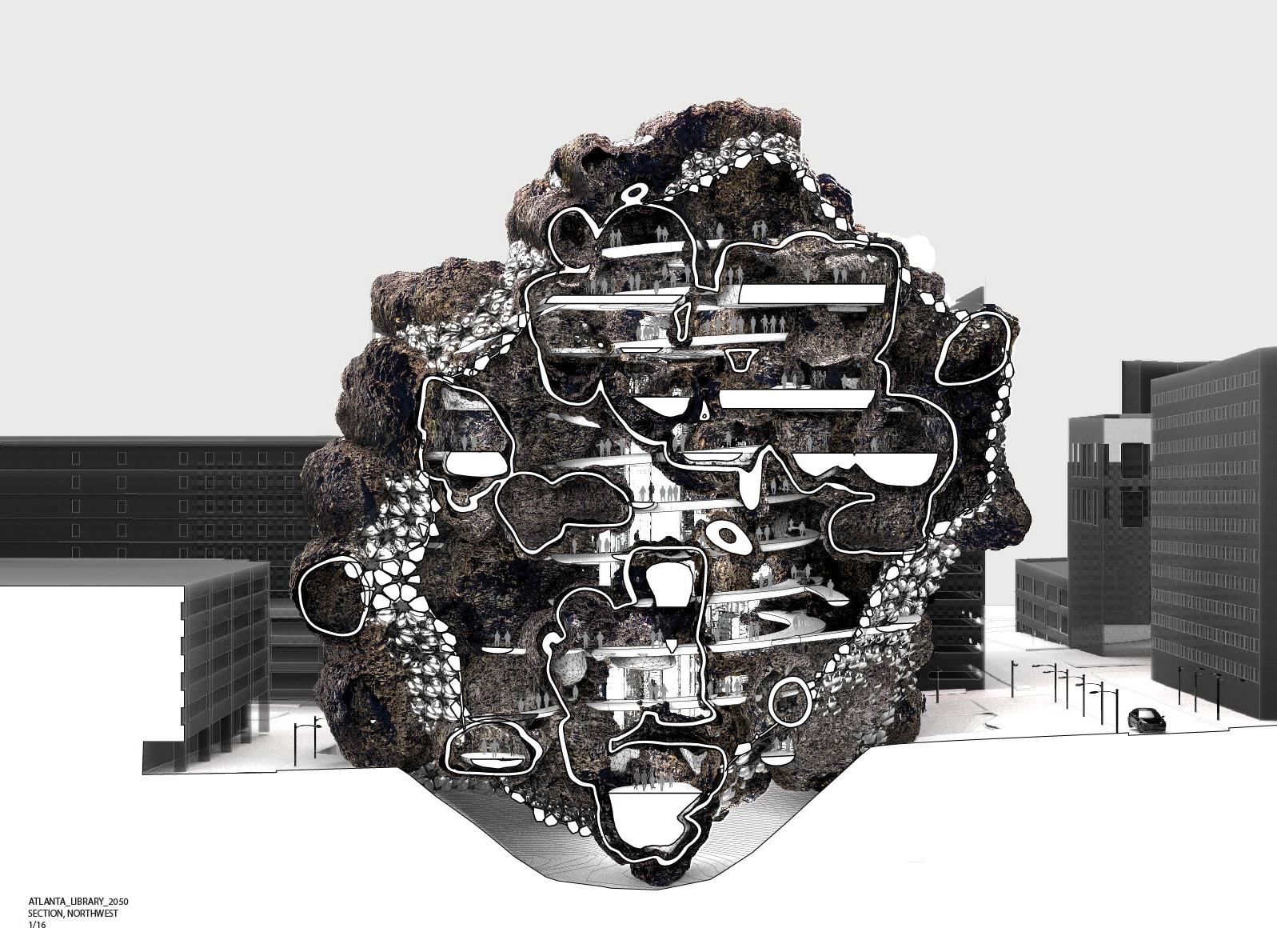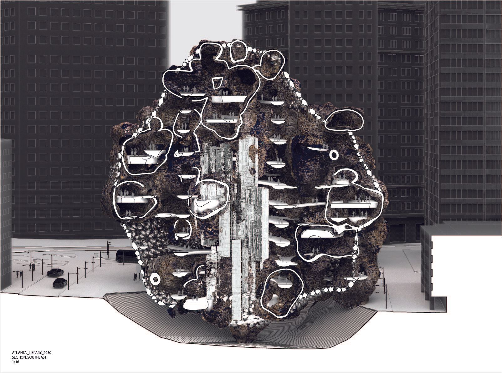 Our goal is to create a library for the people in the twenty first and twenty second century. There is nothing that you cannot view from a image on your phone or get via delivery to your front door. Today people only go to their local library if they need a book, or need access to a computer, these days will soon be in the past. To create a successful building is to create a place that people want to go to, not a place people travel to out of necessity. This idea is reinforced by the specific needs of a city like Atlanta. It has an unwelcoming environment that creates a cold experience for pedestrians and a forgettable one for those traveling by car.