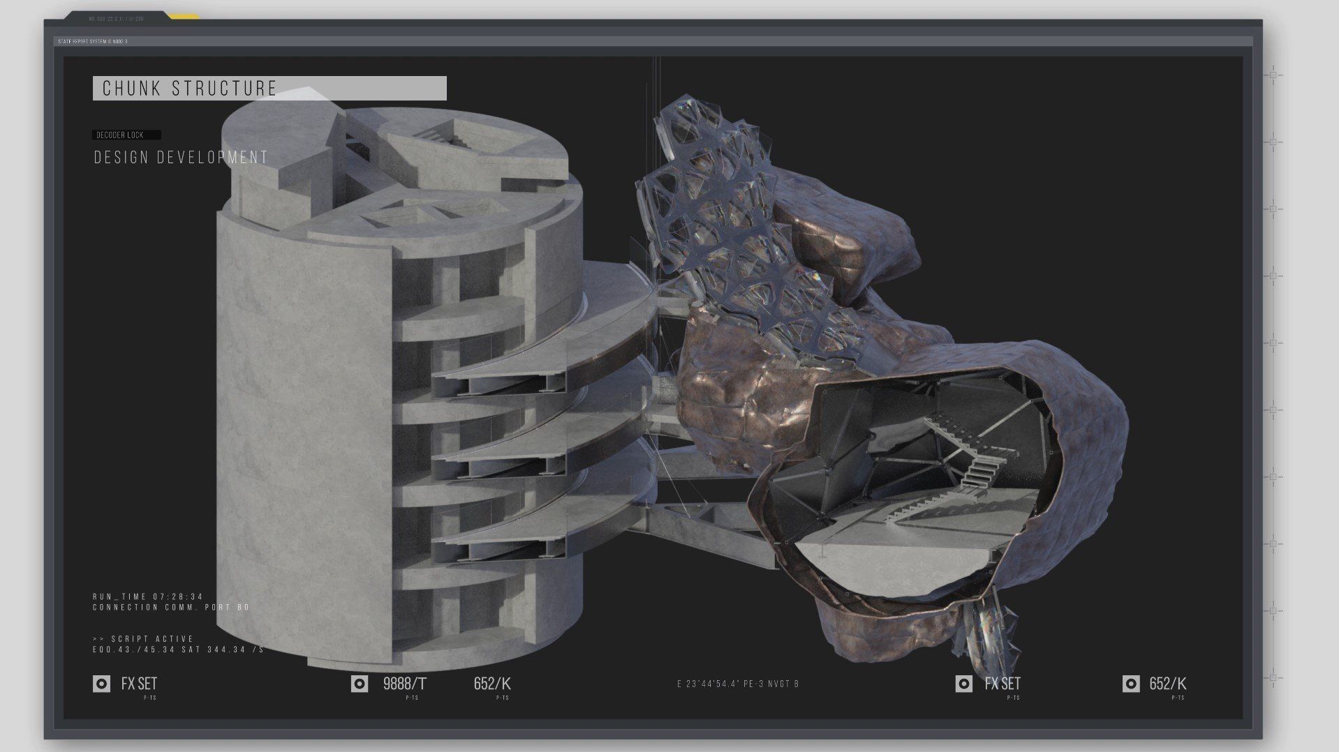 The building is a sensory overload as with the information it contains. Screens, projections, AR, and holograms put more information around you than you can consume. This is reflected in the textures and complex spatial qualities of the program. Flashing lights from the thousands of servers in the core, the rough cave-like texture in the rocks, the bright lights around the ramps, the dark crevices and holes in the corners of rooms, the lush green grass and vegetation of the gardens.
